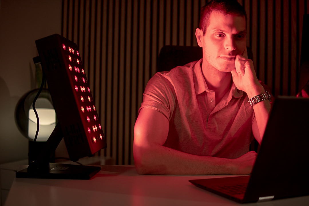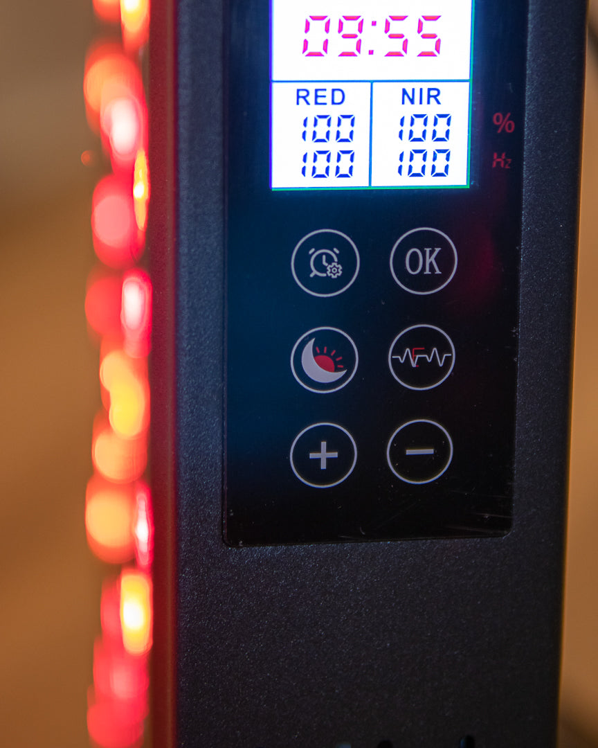2. Settu tækið í samband. Það er hægt að velja úr rauðljósameðferð, infrarauða meðferð eða bæði samtímis fyrir hámarks árangur.